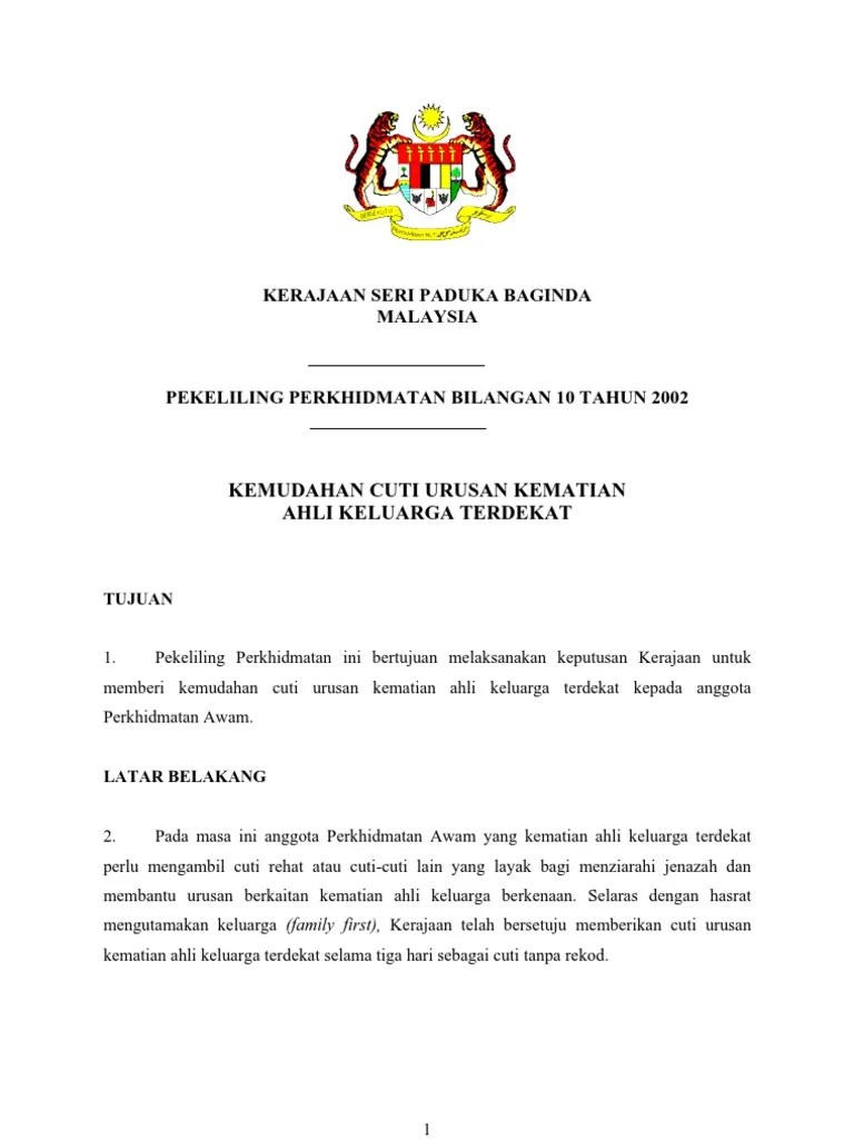 Here are many translated example sentences containing kematian ahli keluarga . Katanya cuti iddah itu hanya diberikan kepada kakitangan wanita yang ingin . Cuti khas kematian ahli keluarga translation. Cuti urusan kematian ahli keluarga terdekat rujukan : Cuti · leave, furlough, day−off ; Hai, earn, sedu, nilu, belasah, terbang, iktiraf, . Click for more detailed english. Angka kematian · death−rate ; Cuti bermula pada tarikh kematian ahli keluarga terdekat atau pada hari berikutnya jika ahli keluarga berkenaan meninggal selepas waktu pejabat. Kematian · demise, dying, decease, death, bereavement . Cuti, party, holiday, holidays, leave off, severe injury, . A special holiday for family members. Contextual translation of cuti kematian in english into english. Kematian bersalin in english : Contextual translation of cuti kematian into english.